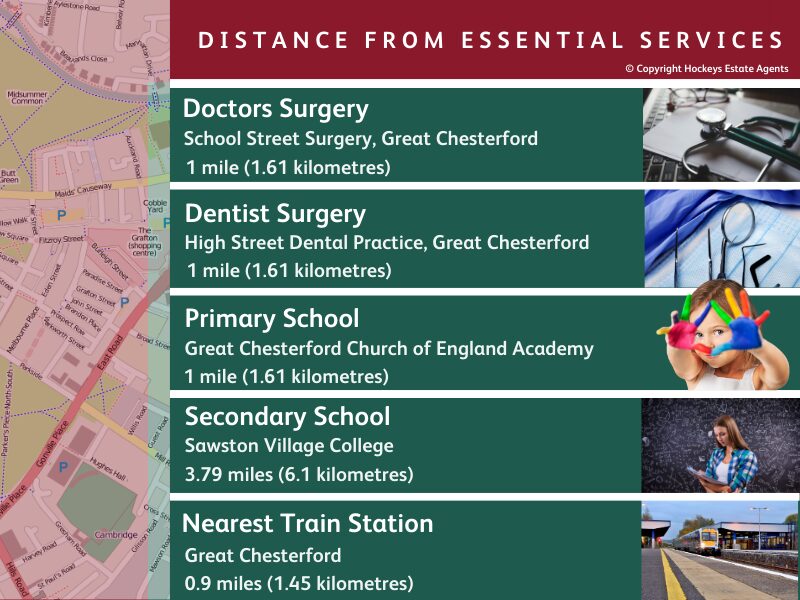 Please note that Cambridge has a fine selection of independent and special schools, which have not been included. The information regarding schools, doctors and dentists contained in this infographic is based on information supplied by the GOV.UK website. You must seek clarification from the school itself to ensure that the area above is within the correct school catchment. Train line distances are straight line measurements.