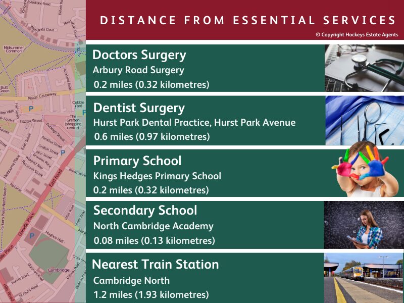 Please note that Cambridge has a fine selection of independent and special schools, which have not been included. The information regarding schools, doctors and dentists contained in this infographic is based on information supplied by the GOV.UK website. You must seek clarification from the school itself to ensure that the area above is within the correct school catchment. Train line distances are straight line measurements.